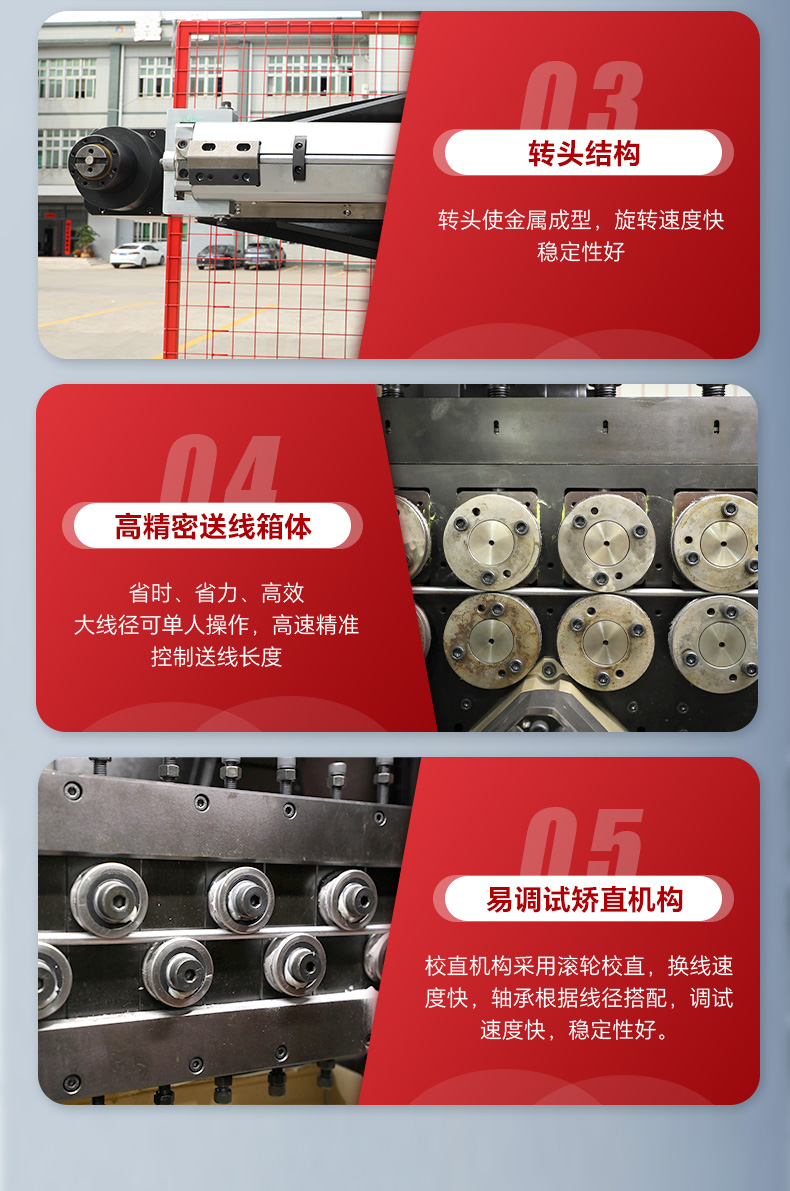 產品特點:適用于生產汽車零部件、汽車門鎖拉桿、工藝品金屬線、廚具餐具支架、倉儲籠、超市貨架、手推車等線材成型產品;轉頭與送線完全分離,真正可實現轉頭時不轉線,確保送線靈活而且穩定性高。